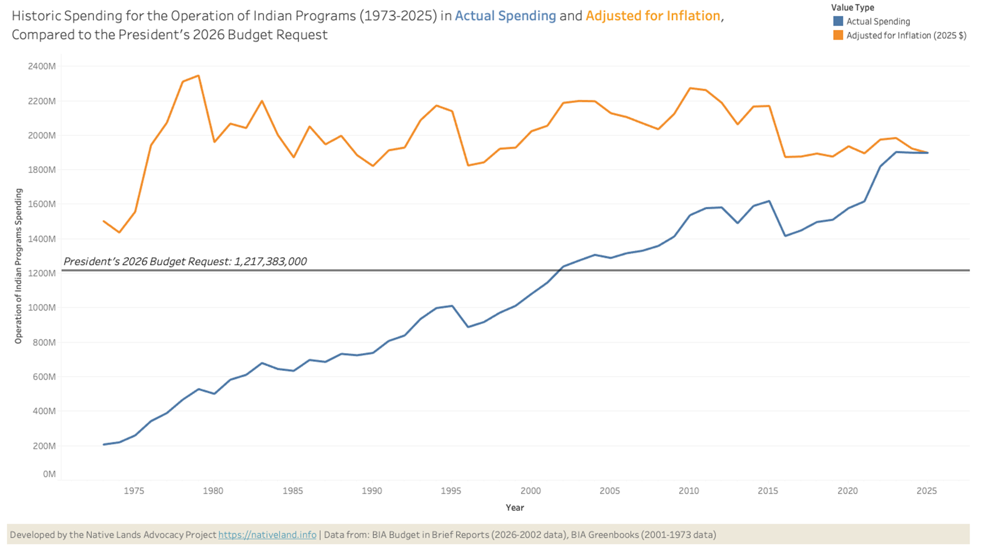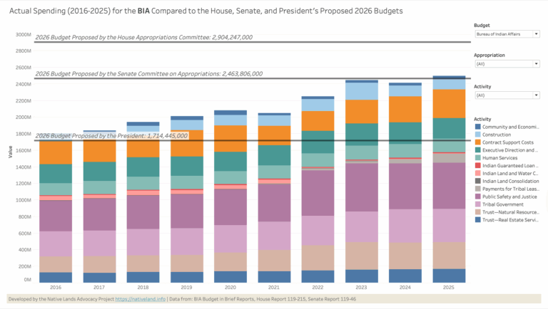 Every year, the United States Congress begins the process of appropriating funds for the following fiscal year. While it’s important that voters are aware of these funding decisions in order to advocate for their areas of concern—and it is especially vital for Tribal Nations and their citizens to assess how the U.S. is meeting its self-appointed trust responsibility via the disbursement of funds—this process can nonetheless be difficult to follow. In our recent storymap, the Native Lands Advocacy Project (NLAP) outlines what we currently know about 2026 funding for Indian Country by focusing on three budgets: the Bureau of Indian Affairs (BIA), the Bureau of Indian Education (BIE), and the Bureau of Trust Funds Administration (BTFA).